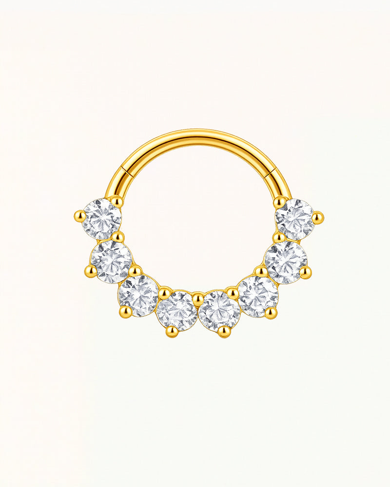 Deze elegante ringvormige piercing is ontworpen met een reeks sprankelende, rond geslepen edelstenen die samen een luxe en verfijnde uitstraling creëren. De zorgvuldig geplaatste stenen volgen de natuurlijke ronding van de ring, wat zorgt voor een harmonieus en evenwichtig design dat direct in het oog springt.